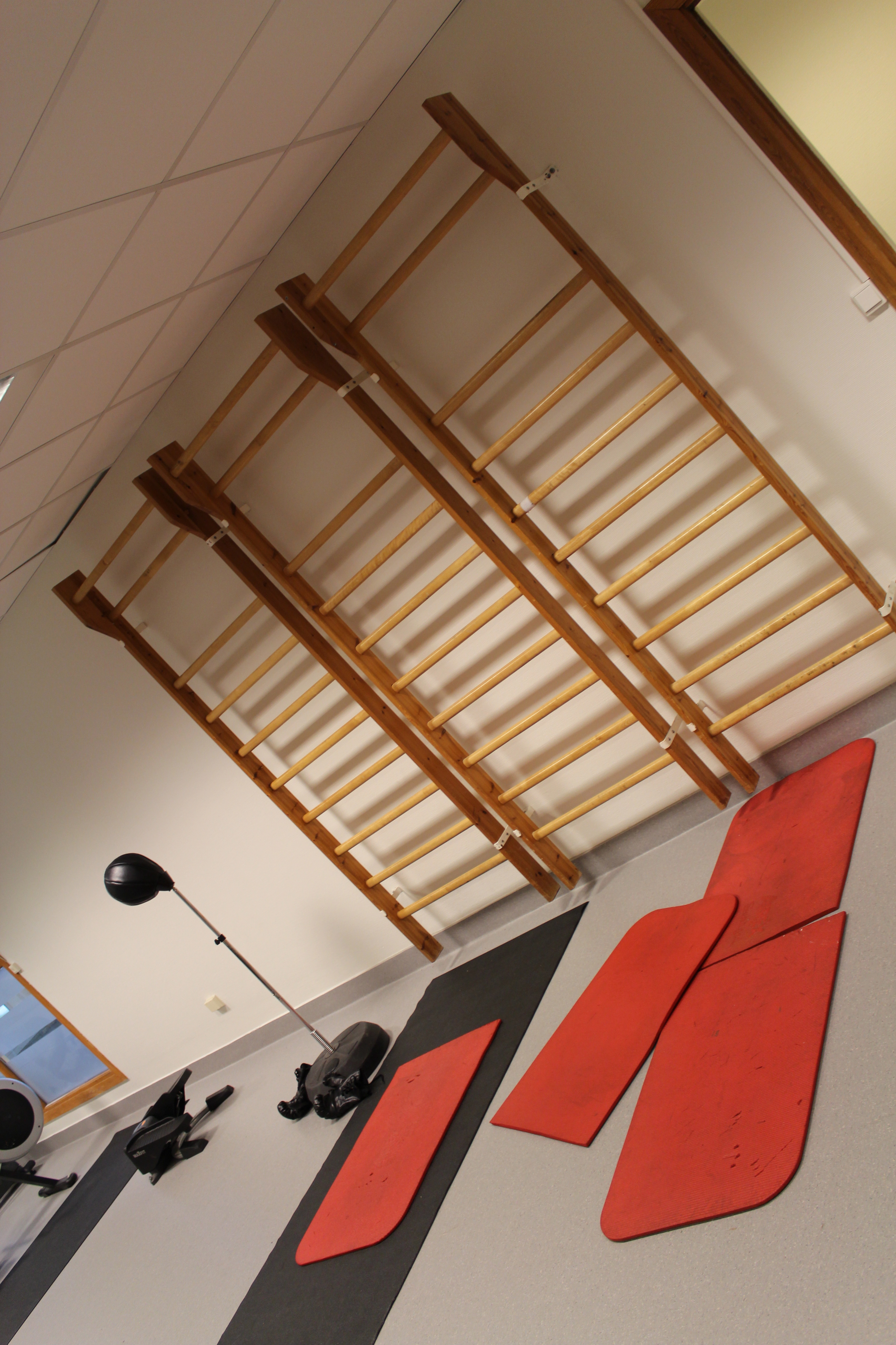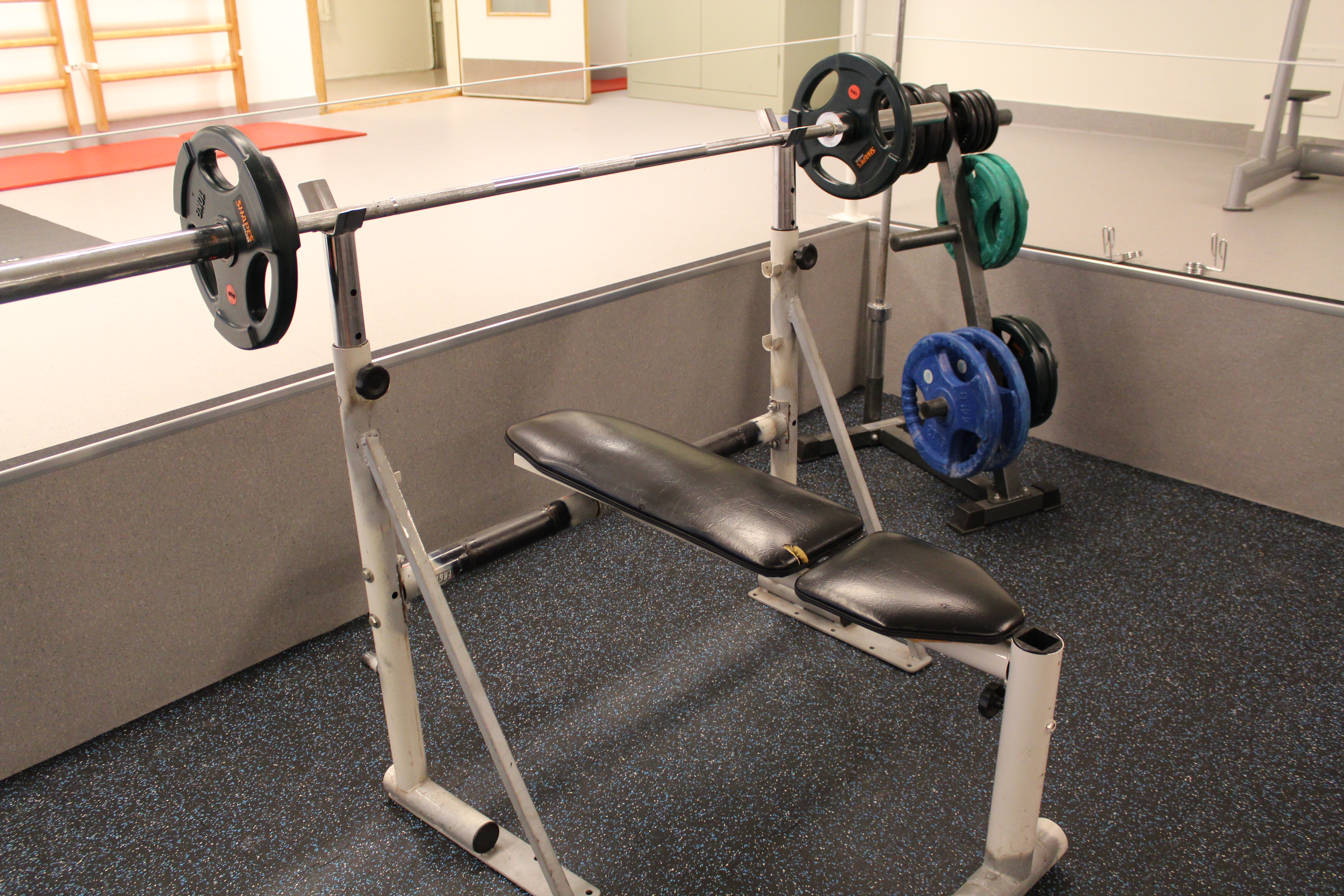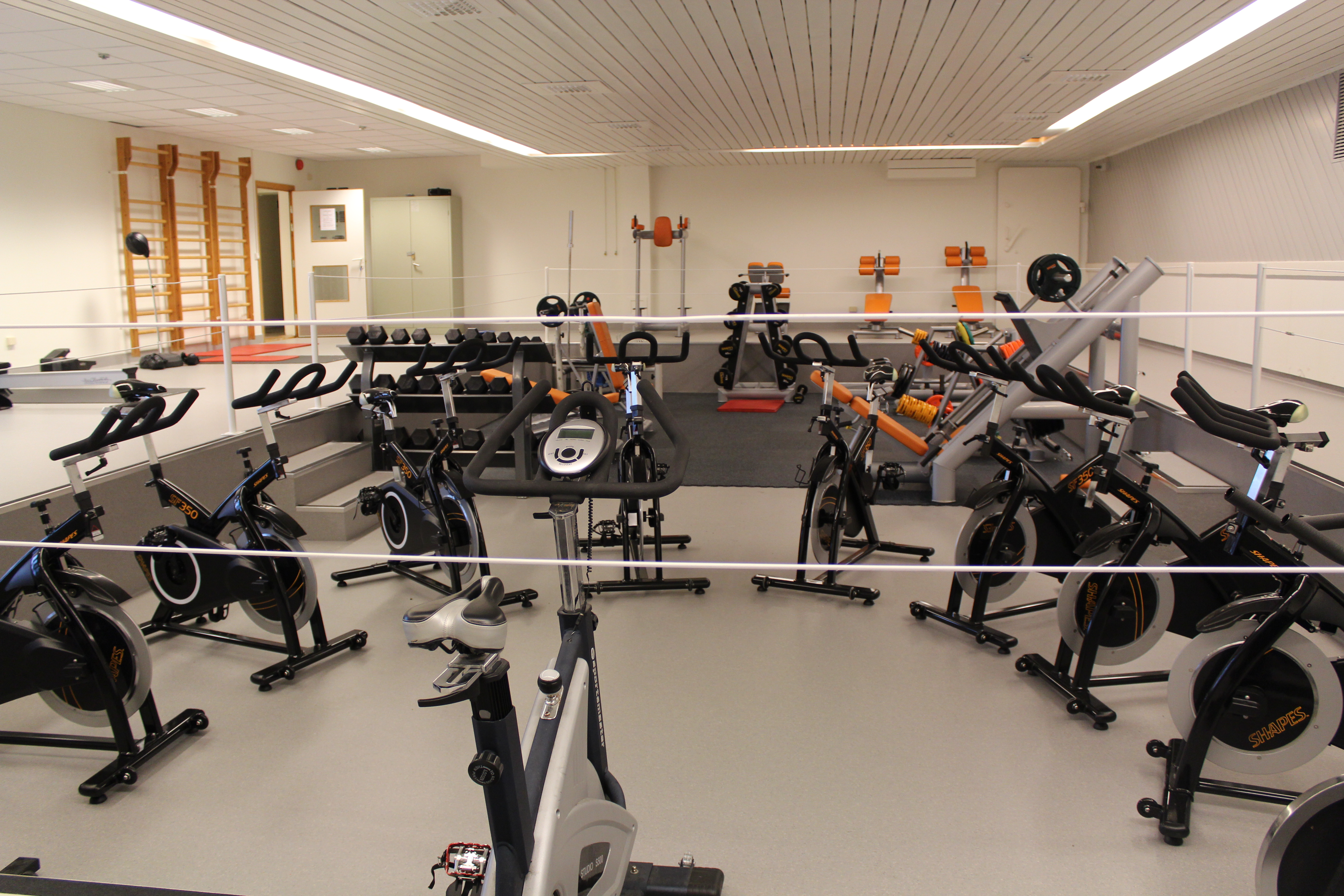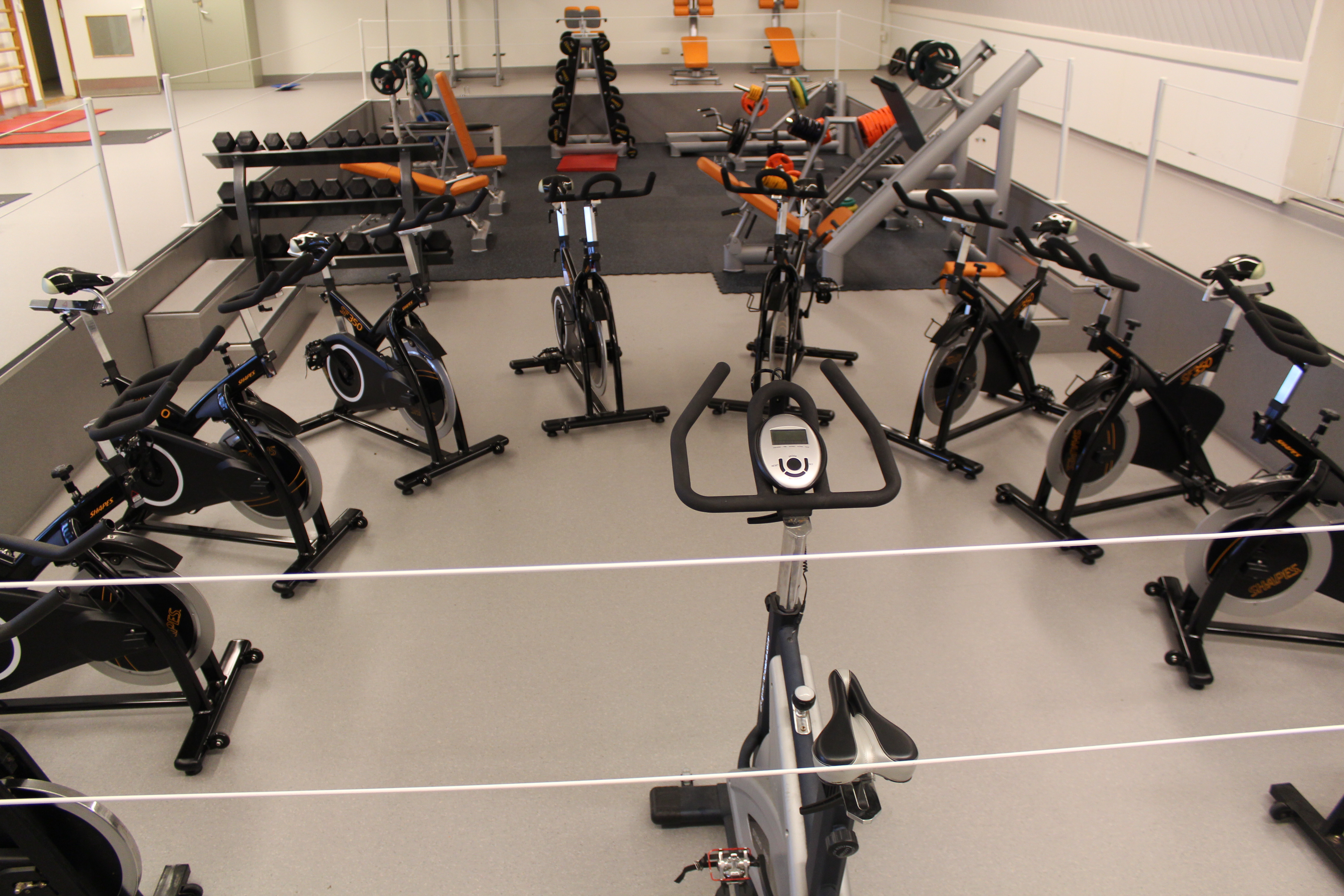 Regler for bruk av treningsstudio står oppført i rommet – Husk innesko.