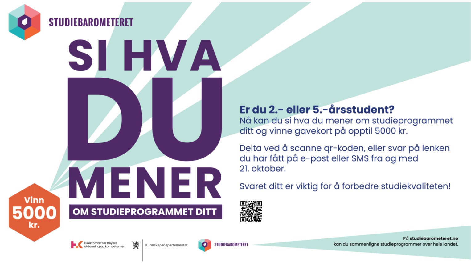 Forside Studiebarometeret 2025 Studiebarometeret 2025 Si hva du mener om studieprogrammet ditt En personlig lenke til undersøkelsen sendes til deg som er 2.- eller 5.-årsstudent via e-post den 21. oktober. Det tar 10-12 minutter å svare på spørsmålene. Alle som svarer på undersøkelsen, er med i trekningen av 5 gavekort på 5000 kroner og 15 på 1000 kroner. All informasjon vil bli behandlet konfidensielt, og det skal ikke offentliggjøres data som gjør det mulig å identifisere den som svarer. Undersøkelse er åpen fra 21. oktober til 12. november. Resultatene publiseres på studiebarometeret.no. Her kan du sammenligne studieprogrammer over hele landet.